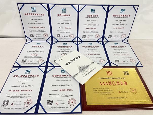 熱烈祝賀江西咚咚餐飲服務有限公司榮獲人行備案機構的3A信用認證(AAA信用認證),獲得3A信用證書(AAA信用證書),獲得AAA級信用企業證書、AAA級誠信供應商、AAA級立信單位、AAA級企業信用等級證書、AAA級資信等級證書、餐飲行業AAA級誠信單位、AAA級重合同守信用企業、誠信職業經理人、AAA級質量服務誠信單位、誠信企業家、AAA級誠信經營示范單位證書等。